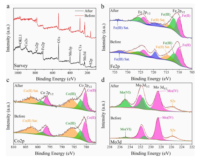 圖4. SFCMG的XPS圖譜:(a)Survey,(b)Fe 2p,(c)Co 2p和(d)Mo 3d。