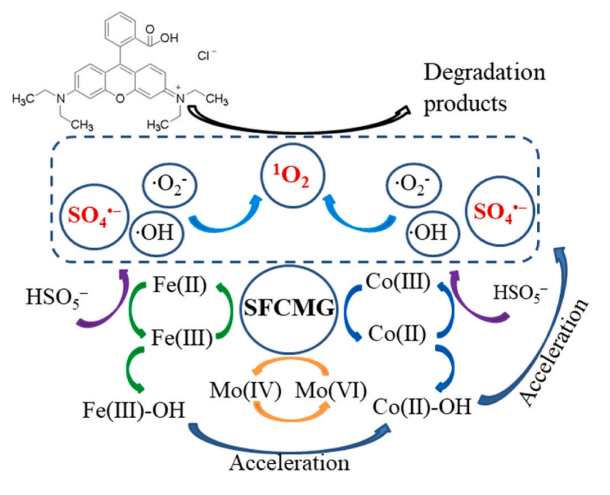 傳統粉末催化劑的回收和聚集問題難以解決,極大地限制了其實際應用,通過簡單的浸漬熱解方法,開發了一種可回收的氧化石墨烯(GO)負載的3D-MoS2/FeCo2O4海綿(SFCMG)。SFCMG能有效激活過一硫酸鹽(PMS)生成快速降解羅丹明B (RhB)的活性物質,在2 min和10 min內RhB的去除率分別為95.0%和100%。氧化石墨烯的存在增強了海綿的電子傳遞性能,三維三聚氰胺海綿作為襯底為FeCo2O4和MoS2/GO雜化片提供了高度分散的載體。SFCMG表現出Fe和Co的協同催化作用,通過MoS2共催化促進Fe(III)/Fe(II)和Co(III)/Co(II)的氧化還原循環,增強了其催化活性。電子順磁共振結果表明,SFCMG/ PMS體系中均有SO4·-、O2-1O2參與,其中1O2在RhB降解中發揮了突出作用。該體系對陰離子(Cl-、SO42-、H2PO4-)和腐殖酸具有良好的耐蝕性,對多種典型污染物具有優良的降解性能。此外,它可以在較寬的pH范圍(3-9)內有效工作,具有高穩定性和可重復使用性,金屬浸出遠低于安全標準。本研究拓展了金屬共催化的實際應用,為處理有機廢水提供了一種很有前景的類芬頓催化劑。