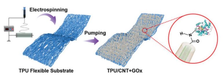 隨著植入式微電子的新興需求,它本質上需要完全集成和可靠的電源。該研究報告了一種可拉伸且靈活的基于靜電紡絲的葡萄糖/O2具有葡萄糖氧化酶生物陽極、Pt/C 陰極和熱塑性聚氨酯基板的生物燃料電池,能夠適應個體運動引起的各種應力和應變。熱塑性聚氨酯的剛性苯環和彈性鏈段保證了其優越的拉伸性能。此外,通過酰胺反應在3D熱塑性聚氨酯網絡中建立活性碳納米管(CNTs-COOH)和葡萄糖氧化酶之間穩定的共價連接,以確保生物陽極的快速直接電子轉移和柔性環境中設備的穩定功率輸出。該生物燃料電池具有 0.575 V 的開路電壓和 57 µW cm