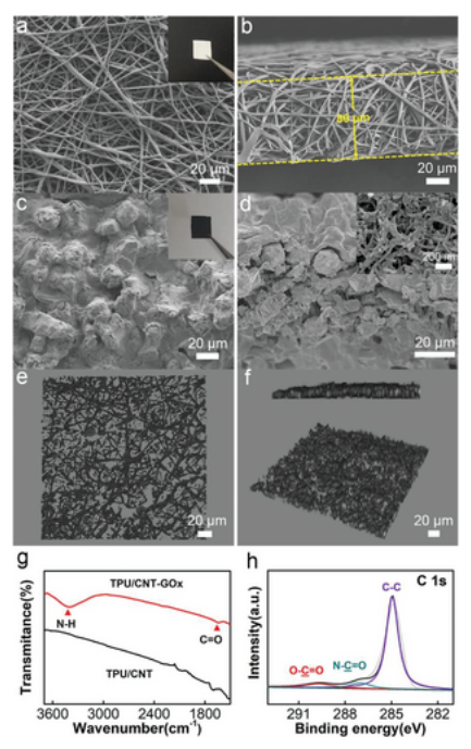Fig 2. a) TPU 柔性基材的 SEM 圖像、光學照片(插圖)和 b) 橫截面 SEM 圖像;c) TPU/CNT+GOx的SEM圖像、光學照片(插圖)、d)橫截面SEM圖像和高倍SEM圖像(插圖);e) 2D CLSM 和 f) TPU/CNT+GOx 吸附 FITC 后的 3D 觀察(黑色);g) TPU/CNT 和 TPU/CNT+GOx 的 FTIR 光譜和 h) TPU/CNT+GOx 的 C 1s 的高分辨率 XPS 光譜。