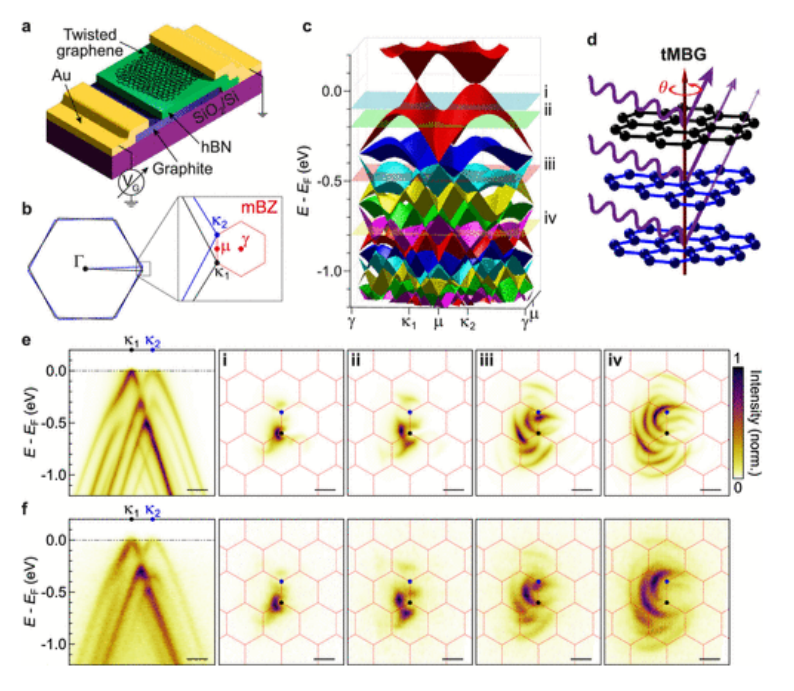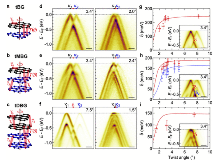圖2:ARPES能量-動量譜的扭曲角和層數依賴性。(a–c)分別用層間和層內耦合參數標記的tBG、tMBG和tDBG的示意圖。(d–f)實驗ARPES能量動量在κ