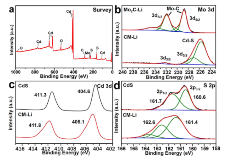 圖3. (a) CM-Li測量譜。比較CM-Li和Mo2C−Li的(b) Mo 3d區域和純Cd和CM-Li的(c,d) Cd 3d和S 2p的高分辨率XPS光譜。