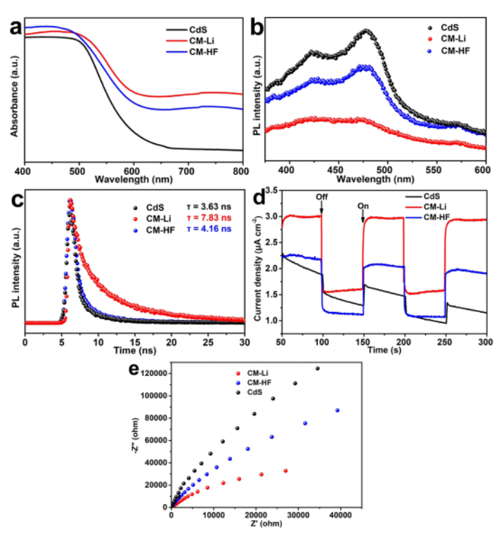 圖6. (a) UV - vis DRS, (b)穩態和(c)時間分辨PL光譜,(d) TPC響應,(e) CM-Li, CM-HF和純cd的EIS圖。
