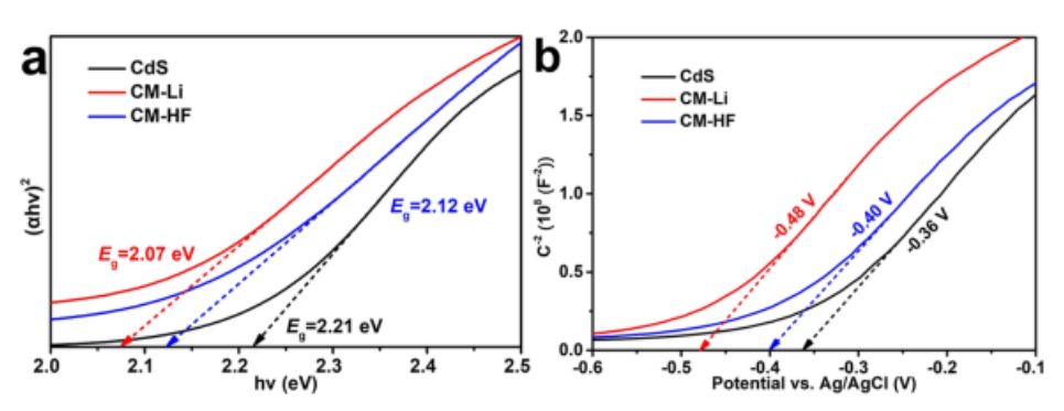 圖7. (a) (αhv)2相對于光子能量(hv)的Tauc圖;(b) CM-Li、CM-HF和CdS的Mott−Schottky圖。
