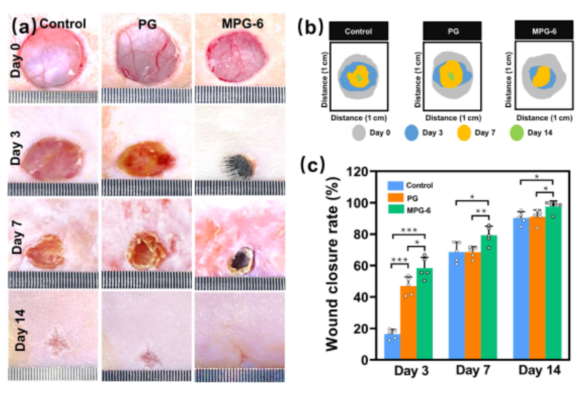 內源性電場(EFs)可調節創面愈合過程中皮膚細胞的行為。然而,目前大多數敷料主要是被動修復缺損組織,缺乏主動響應生理電信號的能力。本文利用同軸靜電紡絲技術,結合聚己內酯(PCL)的良好力學性能、明膠的生物活性和Ti3C2Tx MXene的電活性,制備了一系列納米纖維膜(NFMs),作為皮膚創面愈合的電活性和抗菌敷料。所獲得的NFMs具有良好的機械性能和親水性、優良的電活性、抗菌活性和生物相容性。其中,Ti3C2Tx MXene/PCL/明膠-6 (MPG-6, 6 wt.%的Ti3C2Tx MXene鞘內紡絲液)表現出最優的電導率和抗菌活性。令人興奮的是,該支架顯著促進了電刺激(ES)下NIH 3T3細胞的黏附、增殖和遷移。全層創面缺損模型的體內評估顯示,MPG-6薄膜顯著加速創面閉合,增加肉芽組織形成,增加膠原沉積,促進創面血管化。綜上所述,該多功能支架具有促進生理電信號傳遞從而改善創面再生治療效果的能力,有望成為理想的創面敷料。