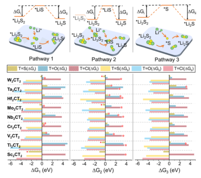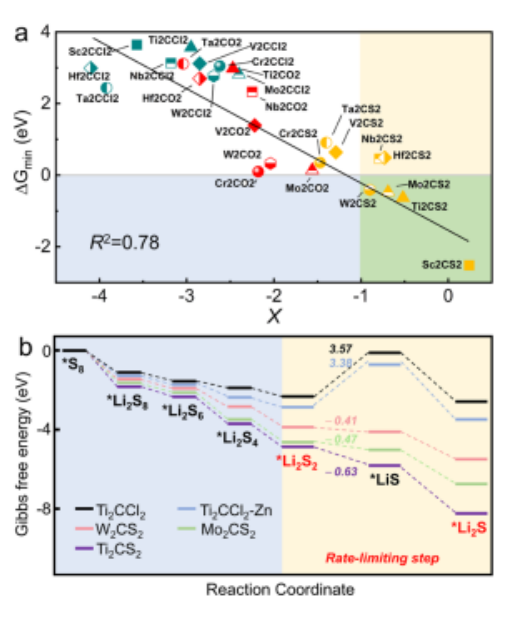 MXenes,二維過渡(2D)金屬碳化物/氮化物,由于其氧化還原活性位點的多樣性和快速的電子轉移,已顯示出作為陰極催化劑的前景,以加速鋰-硫(Li - S)電池中多硫鋰(LiPSs)的轉化。然而,從成千上萬的MXenes中有效地篩選出最優的陰極催化劑是具有挑戰性的。為了解決這一問題,本論文開發了一個模型,可以準確預測Li - S電池中限速步驟的熱力學能量勢壘。MXene位點的局部化學反應性與末端的p帶中心和亞表面過渡金屬的電負性聯系起來。通過密度泛函理論計算和純MXenes與摻雜zn MXenes的對比實驗,定性驗證了模型的準確性。利用該模型,我們篩選了大量的MXenes庫(27種五原子層MXenes),并確定了Ti