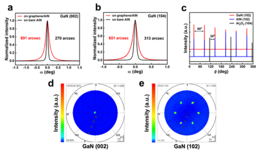 圖4.在第二個GaN生長步驟之后的XRD數據以確認結晶度。(a) GaN(002)在石墨烯/AlN和裸AlN上的搖擺曲線。(b) GaN(104)在石墨烯/AlN和裸AlN上的搖擺曲線。(c) φ-石墨烯/AlN模板上GaN的掃描,顯示平面內排列。(d,e)GaN(002)和(102)的極性圖。