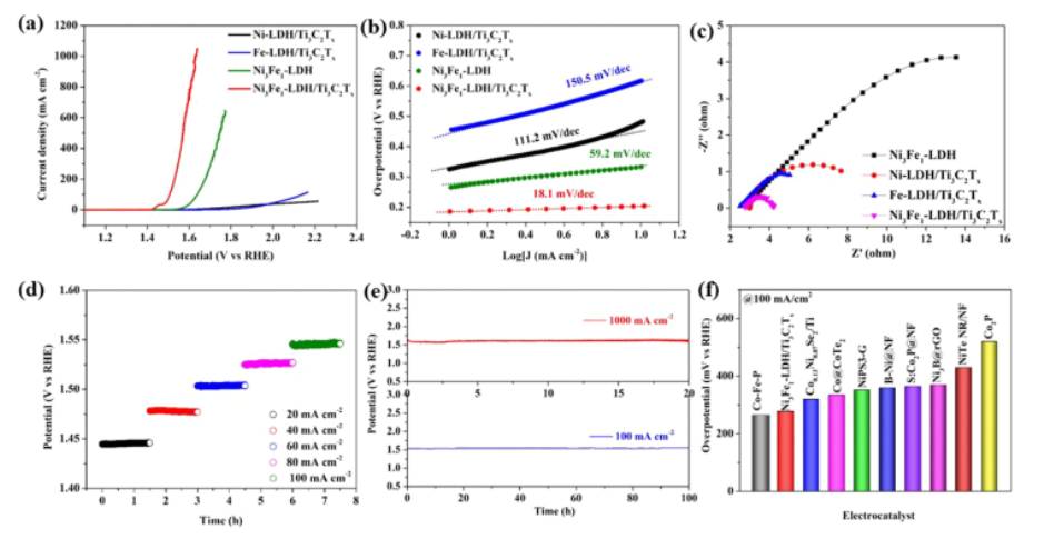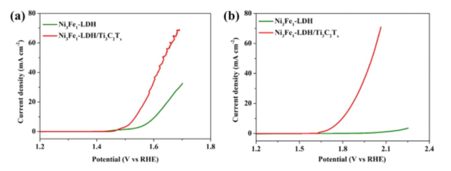 1-LDH /Ti3C2Tx在0.28 V時產生了100 mA cm