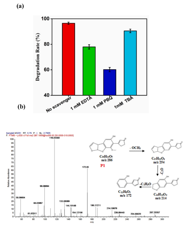 +是光化反應的主要活性物質,UPLC-Q-Orbitrap MS分析鑒定出5種降解產物。同時,處理后的花生油質量仍可接受。更重要的是,CN/GO/SA具有優異的循環穩定性,經過5次循環后,花生油中AFB