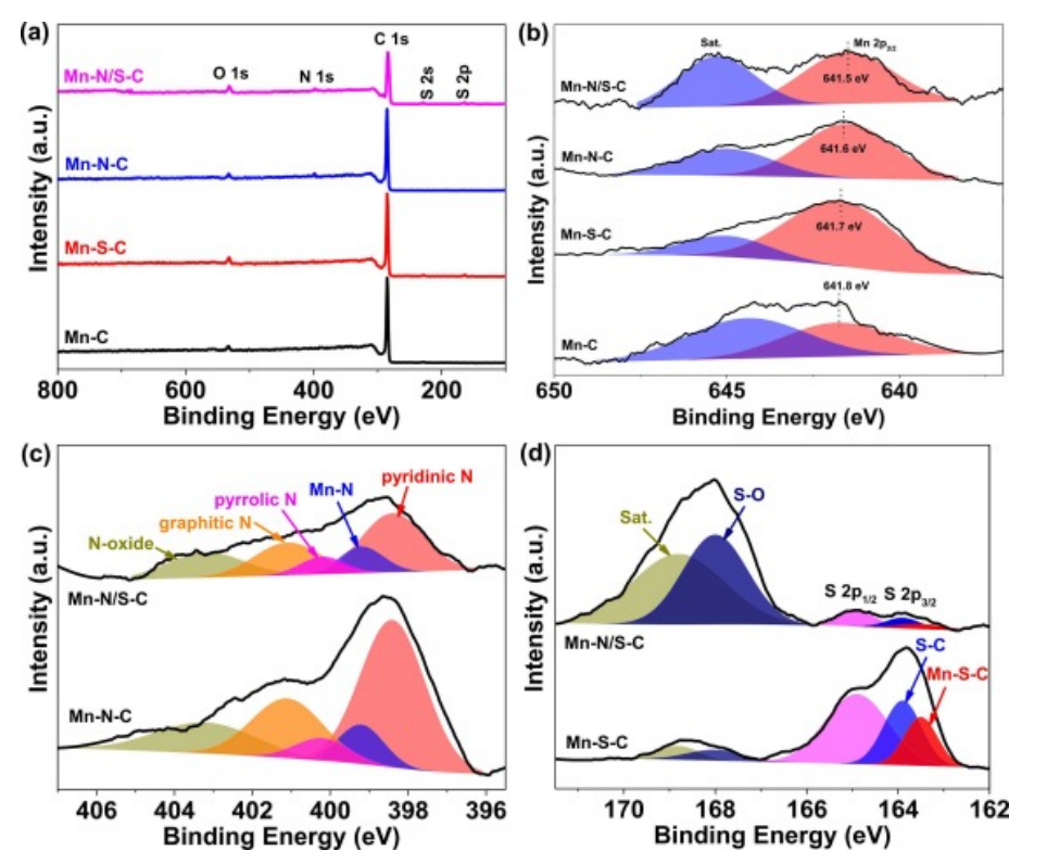 Fig 2. (a) Mn-C、Mn-SC、Mn-NC 和 Mn-N/SC 的 XPS 測(cè)量光譜。(b) Mn 2p、(c) N 1 s 和 (d) S 2p 的 XPS 光譜。