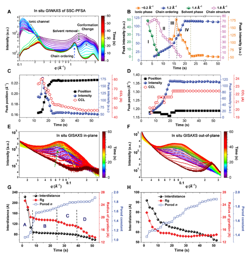 Fig 1. ( A ) SSC-PFSA 成膜過程的原位 GIWAXS表征。( B ) 臨界結(jié)構(gòu)形態(tài)的衍射峰。( C ) 離子相衍射峰 (~0.2 Å