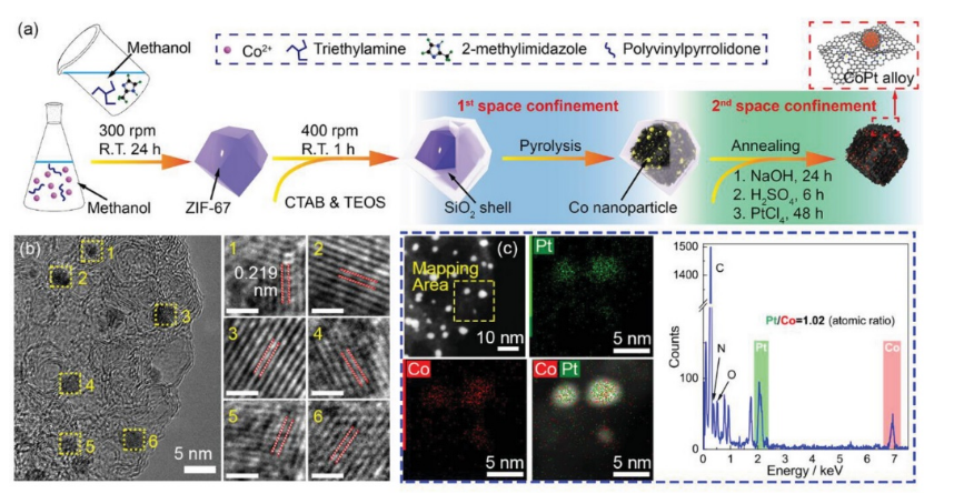 Fig 1. a) ZIF-67 衍生的 CoPt 納米合金催化劑的制造過程示意圖。b) CoZ-60Pt催化劑邊緣和相應晶格條紋的高分辨率TEM圖像。比例尺代表 1 nm。c) Pt和Co元素的STEM元素映射和相應的元素比。