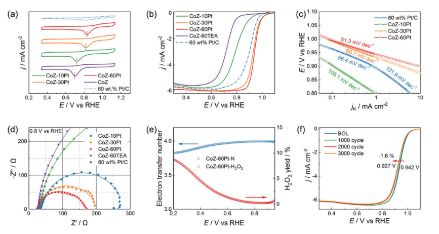 jk )。d) 在 1600 rpm 下通過 RDE 測試,不同催化劑在 0.8 V 與 RHE 的 EIS 曲線。e) CoZ-60Pt 催化劑在 0.1 M HClO
