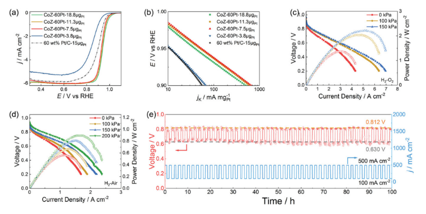 jk )形式給出,通過 RDE 在 1600 rpm 下對Pt 進行歸一化。CoZ-60Pt 的 PEMFC 測試在 80℃下具有不同背壓的 c) H