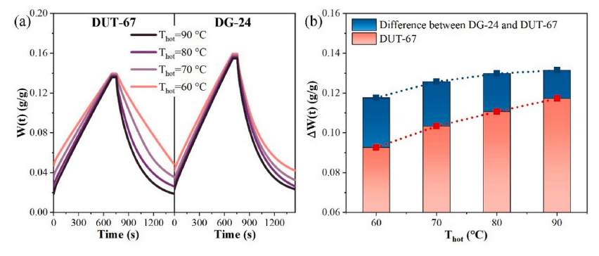 圖5. DUT-67和DUT-67/GO復合材料的(a) 水吸附等溫線(298K)和(b)動力學(303K,0.84kPa)。