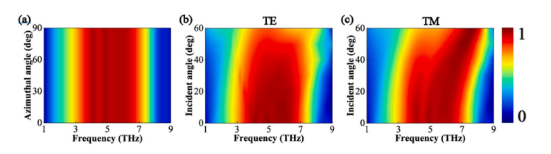 圖7. (a)不同方位角的吸收特性。(b) TE偏振的不同入射角。(c) TM偏振的不同入射角。