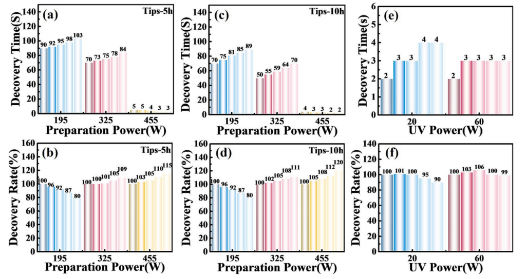 圖4. 影響恢復(fù)時(shí)間和恢復(fù)率的參數(shù)。(a)不同尖端功率下5 h剝離恢復(fù)時(shí)間和(b)恢復(fù)速率;(c)不同尖端功率下10 h剝離恢復(fù)時(shí)間和(d)恢復(fù)速率;(e)不同紫外線(xiàn)強(qiáng)度下的恢復(fù)時(shí)間和(f)恢復(fù)速率。