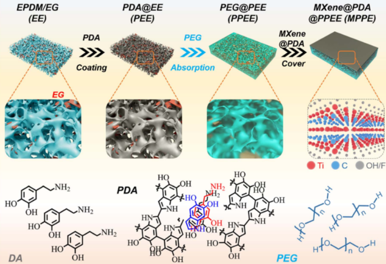 隨著便攜式設備的快速發展,人們需要具有長期穩定性、安全性和舒適性的復合材料。然而,在電磁干擾(EMI)屏蔽、熱管理和抗菌性能方面,單一復合材料實現穩定性、安全性和舒適性具有挑戰性。在本研究中,我們開發了一系列具有MXene層和相變層的層狀非對稱多功能pcc。非對稱結構可將電磁屏蔽效率調節至54.5 dB,并提高光熱/磁熱轉換,協助PCCs維持相當的溫度。由于MXene@PDA具有更好的結構和化學穩定性,在較高的溫度下表現出較高的抗菌活性,因此PCCs具有巨大的抗菌應用潛力。總之,我們的工作為通過非對稱設計制造先進的復合材料提供了新的見解,所獲得的PCCs在EMI屏蔽和無線個人熱治療方面顯示出重要的應用潛力