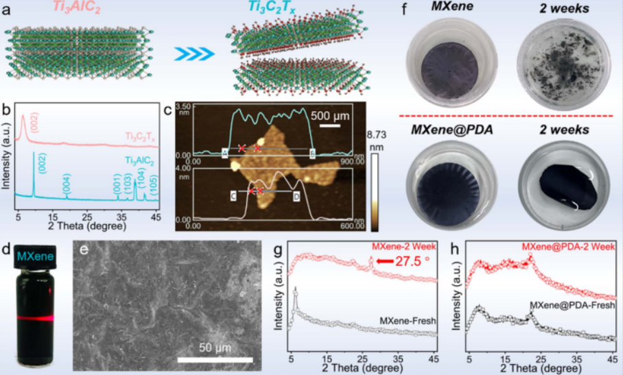 圖3. (a) MXene合成圖解。(b)所得MXene的XRD表征。(c)獲得的MXene的AFM表征。(d)所得MXene分散液的廷德爾效應。(e) MXene@PDA層的表面。(f)數字照片和(g) MXene-Fresh和MXene-2W的XRD圖案。(h) MXene@PDA-Fresh和MXene@PDA-2W薄膜的XRD圖案。