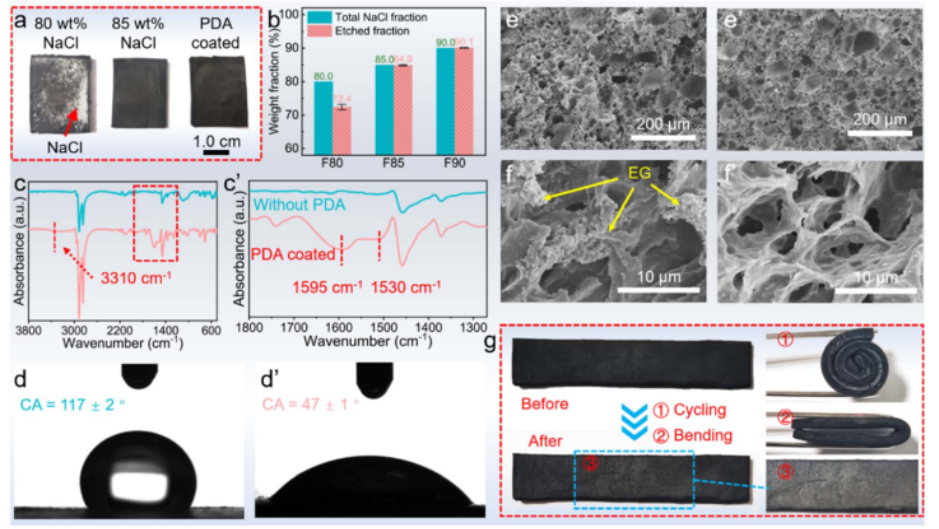 圖4. (a)不同NaCl含量的水蝕刻泡沫和pda涂層泡沫的圖像。(b)不同NaCl含量的水蝕刻的NaCl分數。(c) EE和PEE的FTIR光譜。EE和PEE的接觸角試驗。(e) EE和(f) PEE的SEM圖像。(g) PEE的靈活性。