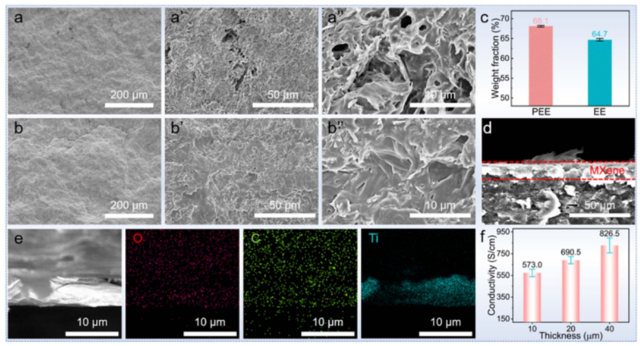 圖5. (a) peg浸漬的EE泡沫和(b) PPEE的SEM圖像。(c) PDA涂覆前后的PEG吸收率比較。(d) MPPE的SEM圖像。(e) MPPE的EDS表征。(f)不同MXene厚度的MPPE的電導率。