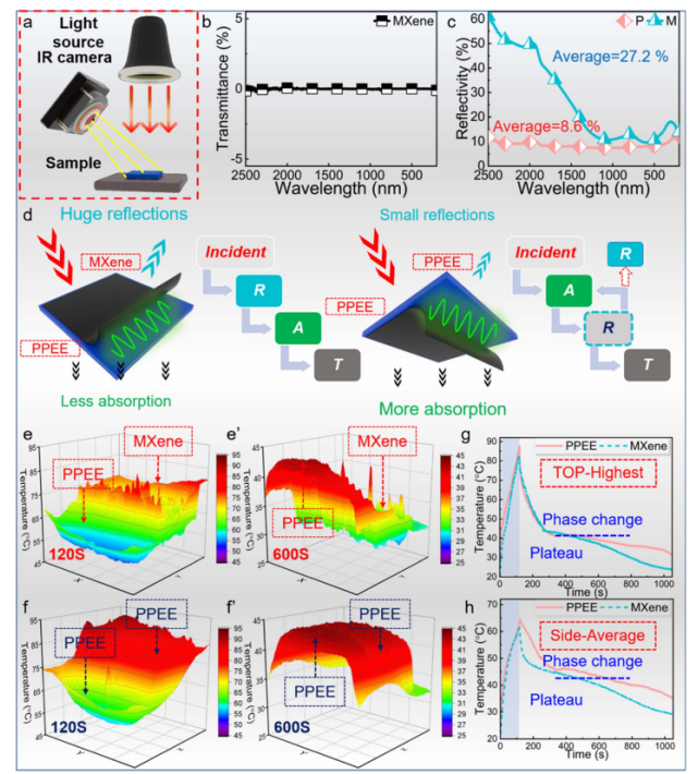 圖7 (a)光熱轉換的設置和溫度監測。(b) MPPE-40的UV-vis-IR透射率。(c) mpe -40的UV-vis-IR反射率。(d)通過具有不同入射光的MPPE的光透射過程的圖解。(e)光從MXene層入射的MPPE的溫度分布。(f)光從PPEE層入射時MPPE的溫度分布。(g)不同入射光下的上表面最高溫度曲線。(h)不同入射光側表面的平均溫度曲線。