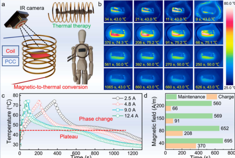 圖8 (a)熱療應用中磁-熱轉換的圖示。(b) 2.5、4.8、9.0、12.4 a電流下PCC的實時圖像(c) 2.5、4.8、9.0、12.4 a電流下PCC的溫度曲線(d) PCC的充電和溫度維持性能。