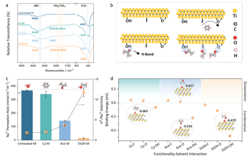 x MXene膜進行侵入性較小但同樣有效的非共價修飾,其中通道被質子溶劑通過氫鍵網絡修飾。密集功能化的(-O, -F,-OH) Ti