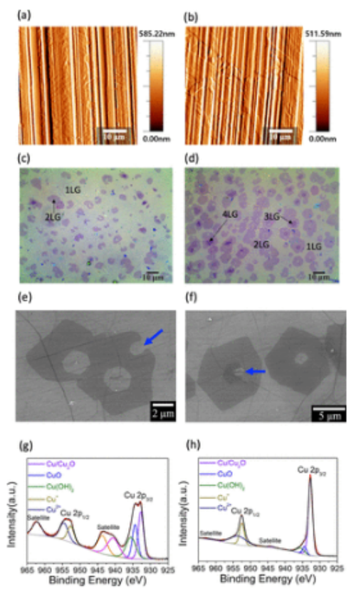 圖3.石墨烯在不同表面形貌的銅箔上的生長和粘附層的形成。(a,b)Cu表面的AFM高度圖像:(a)未拋光的箔,均方根(RMS)粗糙度:137.862 nm和(b)拋光15 s的箔背面,均方根粗糙度:123.752 nm。(c,d)分別在面板(a,b)中所示的表面上生長的石墨烯樣品的OM圖像。(e,f)圖(d)中所示的石墨烯樣品中的蝕刻孔和adlayers的SEM圖像。(g,h)圖(a,b)中所示的Cu表面的Cu 2p XPS光譜。