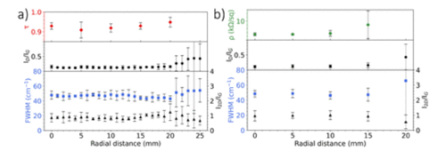 G和fwhm)將合成石墨烯轉移到熔融二氧化硅的透射率作為徑向位置的函數,其中誤差條顯示了不同角度位置(0、90、180和270°)下徑向測量的不確定度。(b) 合成石墨烯的薄層電阻通過共定位拉曼測量(I
