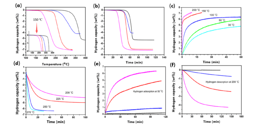 x組合物的起始脫氫溫度降低到150℃,在150~250℃范圍內達到7.2 wt %的氫釋放能力。該組分在200℃下5分鐘內吸收7.2 wt %的氫,在30℃下2小時內吸收5.5 wt %的氫,而在275℃下7分鐘內測量解吸容量(6.0 wt %)。在250℃下150次循環后,保留了6.5 wt %的容量,氫含量的損失可以忽略不計。這些結果歸因于已形成的TiH
