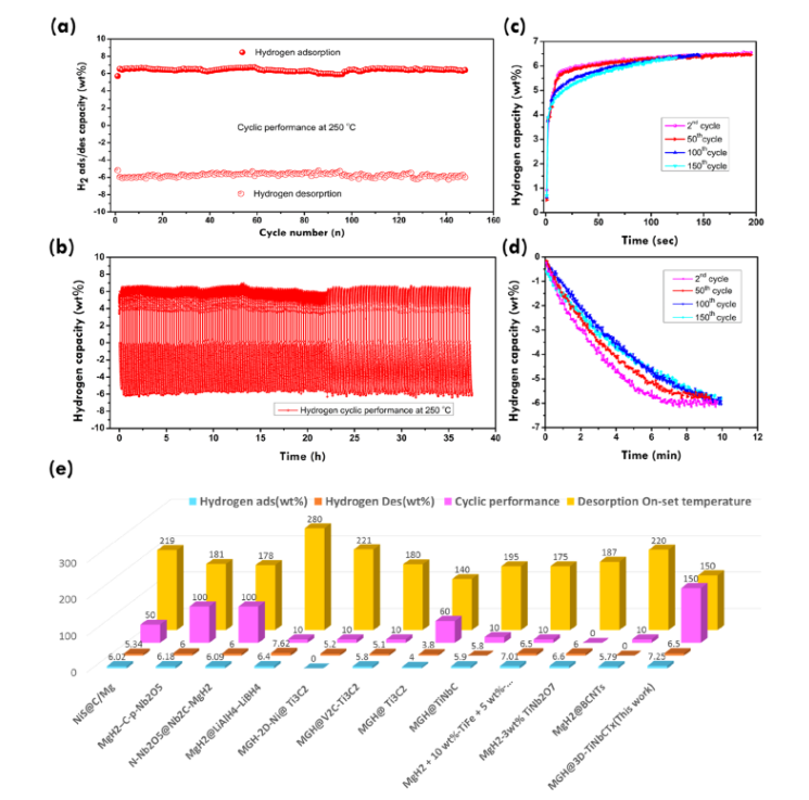 氫化鎂(MGH)是一種高容量、低成本的儲氫材料;然而,慢的動力學速率、高的脫氫溫度和短的循環壽命阻礙了其大規模應用。為了解決這些問題,我們提出了一種設計新型分層三維雙金屬MXene (d-TiNbCT