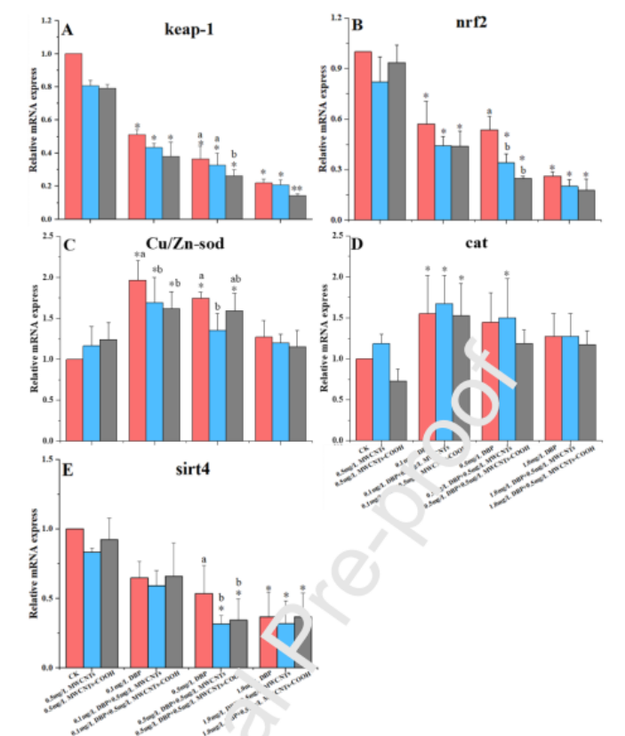 圖4. 不同濃度DBP染毒及與MWCNTs/MWCNTs-COOH共染毒144hpf后,斑馬魚胚胎/幼魚氧化應激相關基因的mRNA相對表達量。