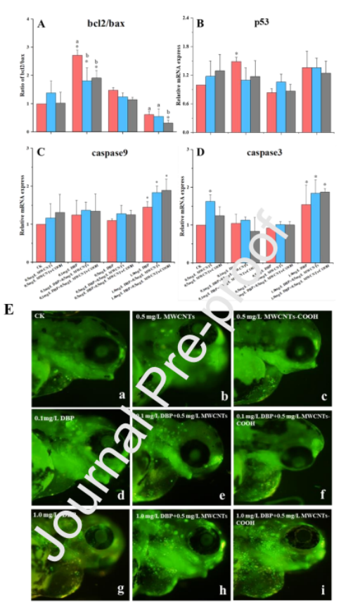 圖5. 不同濃度DBP染毒及與MWCNTs/MWCNTs-COOH共染毒144hpf對斑馬魚胚胎/幼魚凋亡基因mRNA相對表達量的影響.以及不同處理組斑馬魚幼蟲吖啶橙染色后細胞凋亡的變化。