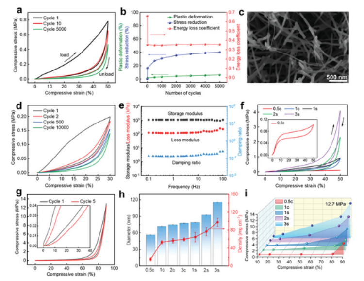 Fig 3. CNT@AC 具有長周期特性、高強度和寬范圍的可調(diào)性。 a) CNT@AC在50%應(yīng)變下5000次循環(huán)的應(yīng)力-應(yīng)變曲線; b) CNT@AC在50%應(yīng)變下循環(huán)5000次后的塑性變形、應(yīng)力減少和能量損失系數(shù); c) 5000 次 50% 應(yīng)變壓縮循環(huán)后 CNT@AC 的 SEM; d)CNT@AC在30%應(yīng)變下10000次循環(huán)的應(yīng)力應(yīng)變曲線; e) CNT@AC動態(tài)力學(xué)測試,加載頻率從0.1 Hz到100 Hz掃描; f) CNT@AC 的廣泛可調(diào)和高強度壓縮響應(yīng)。這里選擇第二個壓縮周期進行繪圖; g) CNT@AC在90%極限應(yīng)變下的應(yīng)力-應(yīng)變曲線; h) 物理性質(zhì)(直徑、密度)隨前體濃度變化; i) CNT@AC 在不同應(yīng)變下的抗壓強度總結(jié)。