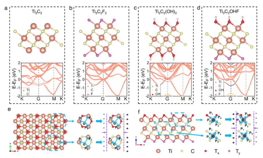 Fig 1. Ti3C2 和 Ti3C2TX 的能帶和晶體結構。 a-d 計算得出的 Ti3C2 和 Ti3C2TX 單層的能帶和偶極矩。 e 單層Ti3C2TX晶體結構的俯視圖,其中簡化的TX-Ti六方結構(上)和Ti-C六方結構(下)發生拉伸變形,從而產生壓電性。 f 單層 Ti3C2TX 晶體結構的側視圖以及 TX-Ti(上)和 Ti-C(下)鍵在 x-z 平面拉伸過程中晶體結構變形的簡化模型,從而產生壓電性。