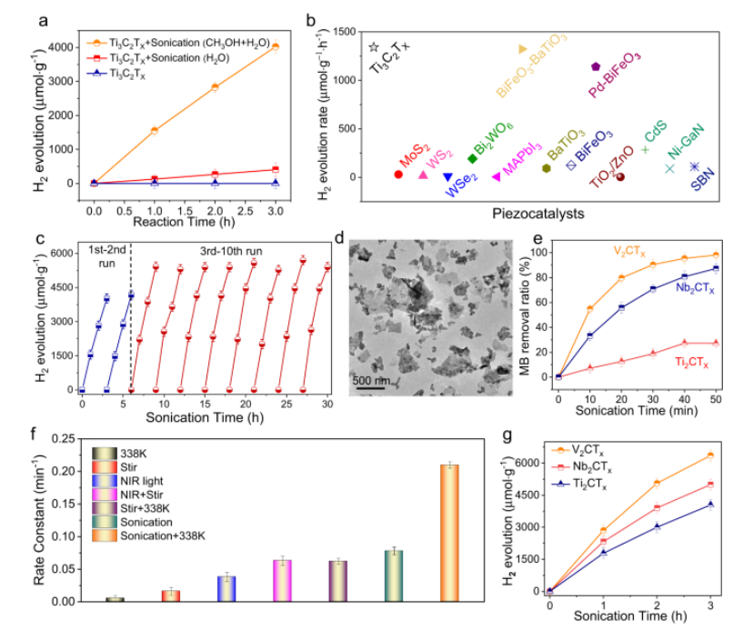 Fig 5. MXene 上的催化氫氣生產和 MB 降解。黑暗中超聲處理下 Ti3C2TX 的 H2 生產。b Ti3C2TX 與一些報道的典型壓電催化劑的析氫性能比較。 c Ti3C2TX在超聲處理下的穩定性。 d 十個循環反應后 Ti3C2TX 的 TEM 圖像。e 在超聲處理條件下,MB 在 MXene 材料上的催化降解。 f 不同反應條件下 V2CTX 上 MB 的催化降解。 g H2 在黑暗中超聲處理下產生 V2CTX、Nb2CTX 和 Ti2CTX。 (a–c, e–g)中的所有數據均收集了3次,誤差線代表標準差。
