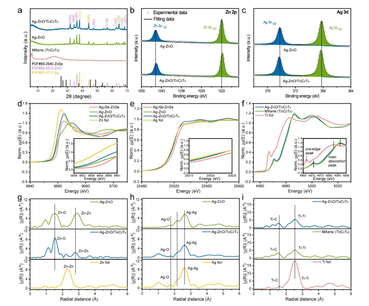 Fig 2. a) XRD 圖譜,b–c) Ag- ZnO 和 Ag- ZnO/Ti3C2Tx 的 b) Zn 2p 和 c) Ag 3d 的 XPS 譜,d–f) XANES 和 d) Zn 的放大(插圖)譜, e) Ag 和 f) Ag2Se- ZnSe、Ag- ZnO、Ag- ZnO/Ti3C2Tx 的 Ti K 邊緣,以及 Zn 箔、Ag 箔、Ti 箔和原始 MXene 的參考文獻以及相應的預插入插圖-edge, g–i) g) Zn、h) Ag 和 i) Ti 的 EXAFS 光譜的相應 k