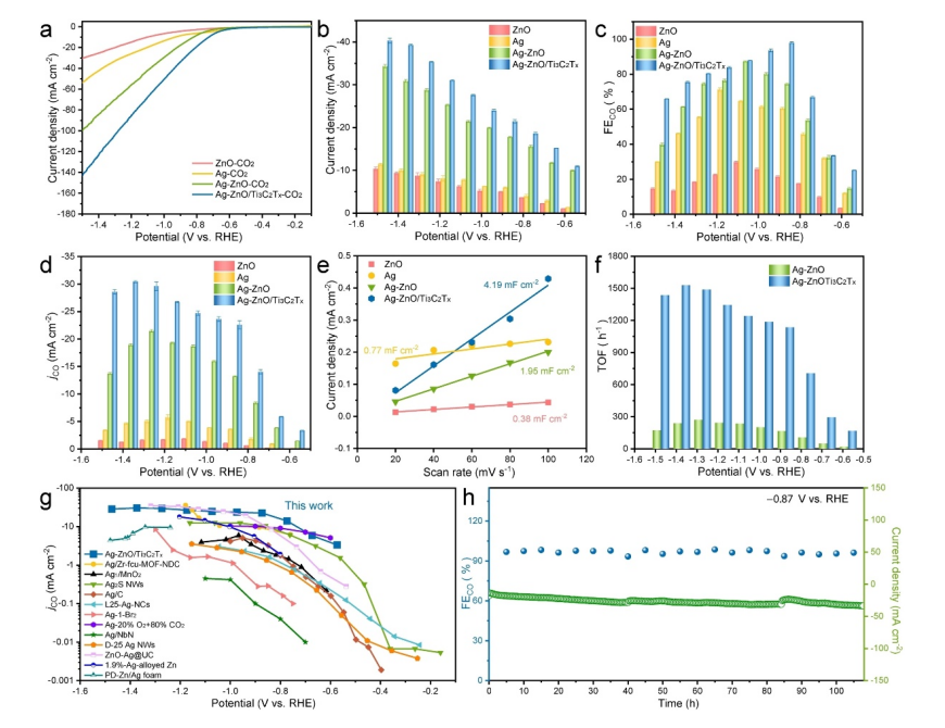 -2 。 MXene 調控的 Ag- ZnO 界面內 Ag 的電子供給和相對于費米能級上移的 d 帶中心有助于CO的高選擇性。CO