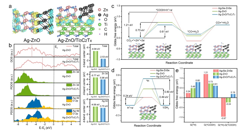 Fig 5. a) Ag- ZnO 和 Ag- ZnO/Ti3C2Tx 的計算電荷密度方案,b) Ag- ZnO 和 Ag- ZnO/Ti3C2Tx 的 Zn 3d、Ag 4d 和 O 2p 軌道的 DOS(左窗格)和相應的 d-譜帶中心(右窗格),c–d) c) eCO2R 和 d) HER 過程的自由能圖,e) 在 Ag2Se- ZnSe、Ag- ZnO 和 Ag- ZnO 上形成 *H 和 *COOH 的自由能變化/Ti3C2TX。