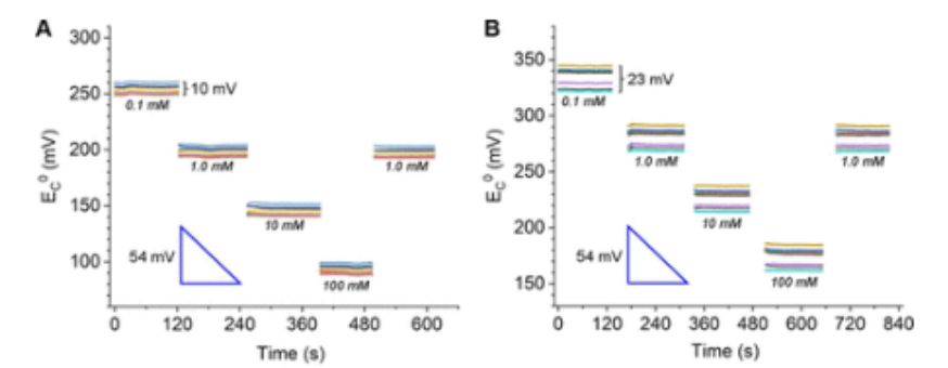圖7.噴涂GrNP觸點提高了用于電位測定的固態電極的批內再現性。(A) 具有石墨烯接觸層的硝酸鹽傳感電極表現出10mV的電壓擴展(N=8);(B) 沒有基于GrNP的接觸的電極具有23mV的擴展(N=8)。
