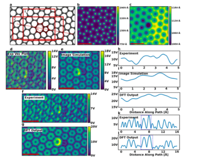 圖2:4D-STEM靜電場結果。(a) 具有(1,0)位錯核的石墨烯片的結構模型用紅色勾勒。插圖區域1定義了面板b–e的視野。插圖區域2定義了面板f和g的視野。位錯芯的七邊形內的圓周紅色箭頭定義了面板h–j中所示的線圖的路徑。紅色虛線表示面板k和l中所示的線輪廓的路徑。(b)未測量和(c)密度泛函理論計算中的涂抹(σ=0.65Å)靜電勢。(d) 帶有箭頭疊加的實驗EPC圖像表示動量轉移到電子探針的方向和大小。(e) |EPC|的畸變4D-STEM多層模擬。支持表2中提供了像差系數和圖像模擬的細節。兩個視場都對應于面板a中的插入區域1。(f)實驗|EPC|圖像,視場顯示在面板a中區域2中,使用獨立原子導出電勢的4D-STEM模擬(i)和不使用圖像模擬的DFT計算(j)。透鏡像差(支持表2)包括在4D-STEM模擬中,并反映在面板e和i中。線圖路徑對應于面板a中用箭頭表示的圓形輪廓。(k和l)實驗和DFT導出的|EPC|圖像的線性線輪廓,分別對應于面板f和g。線條輪廓對應于面板a中的虛線。七邊形環的內部對應于用藍色虛線勾勒的區域。所有比例尺均為5Å。