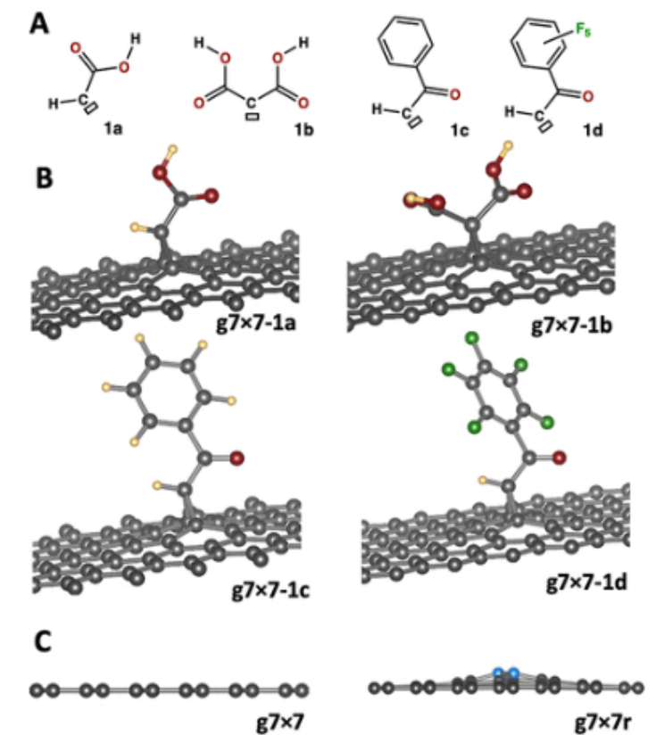 圖1.(A) 用于功能化石墨烯納米片的不同卡賓反應性中間體的化學結構,(B)改性石墨烯納米板(g7×7/1a–d)的2D表示,以及(C)平坦(g7 x 7)和波紋(g7 x 7r)石墨烯襯底的側視圖。顏色代碼:C:黑色(或青藍色),O:暗紅色,H:黃色,F:綠色。