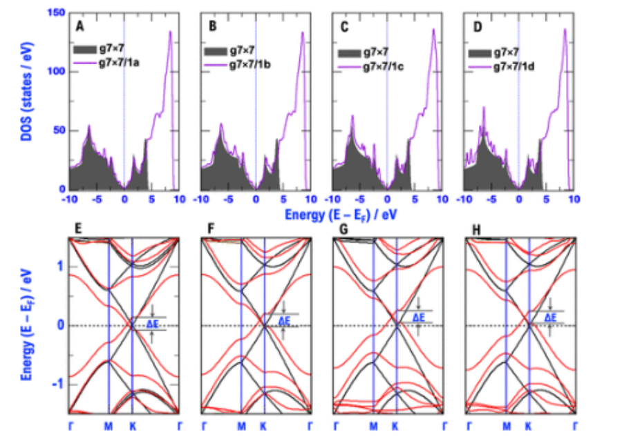 圖2:總DOS(A–D)圖,其中灰色平面圖用于原始石墨烯,紫色圖用于相應的功能化石墨烯。不同卡賓功能化石墨烯納米片g7×7/1a–d的能帶結構(E–H)顯示出在K點的帶隙開口。黑圖是未改性石墨烯的黑圖,用于比較。