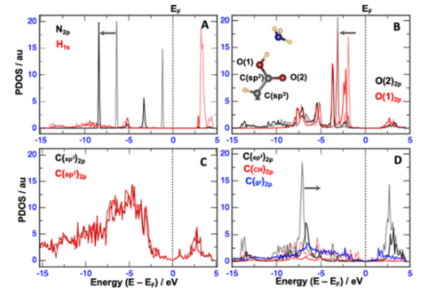 圖4.參與相互作用的原子的PDOS:(A)來自酸性基團的H