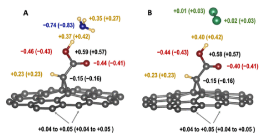 圖5.計算了g7×7/1a與氨(A)和氯(B)相互作用之前和之后的部分電荷。為了清晰起見,石墨烯的原子被去除了。