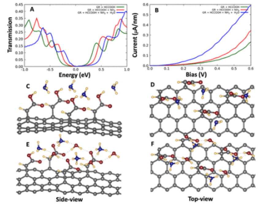 圖7.面板(A)在氨(紅色)存在下和每個羧酸官能團添加一個水分子(藍色)后,裸露(綠色)g7×7/1a納米片在不同能量下的電子透射圖。面板(B)模擬了在存在氨(紅色)和添加水(藍色)后,裸露(綠色)g7×7/1a納米片在不同電位偏壓下的電流密度。面板(C,D)包含與氨分子相互作用的功能化石墨烯層的球和棒表示的不同視圖。面板(E,F)包含添加水分子后與氨分子相互作用的功能化石墨烯層的球和棒表示的不同視圖。虛線表示由羧酸根離子、銨離子和水分子在改性石墨烯表面上建立的氫鍵網絡。