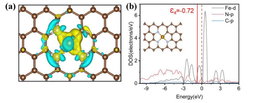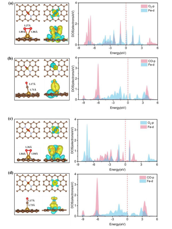 4(d)的俯視圖和側視圖和左側的PDOS。棕色、金色、白色和紅色分別代表C、Fe、N和O。