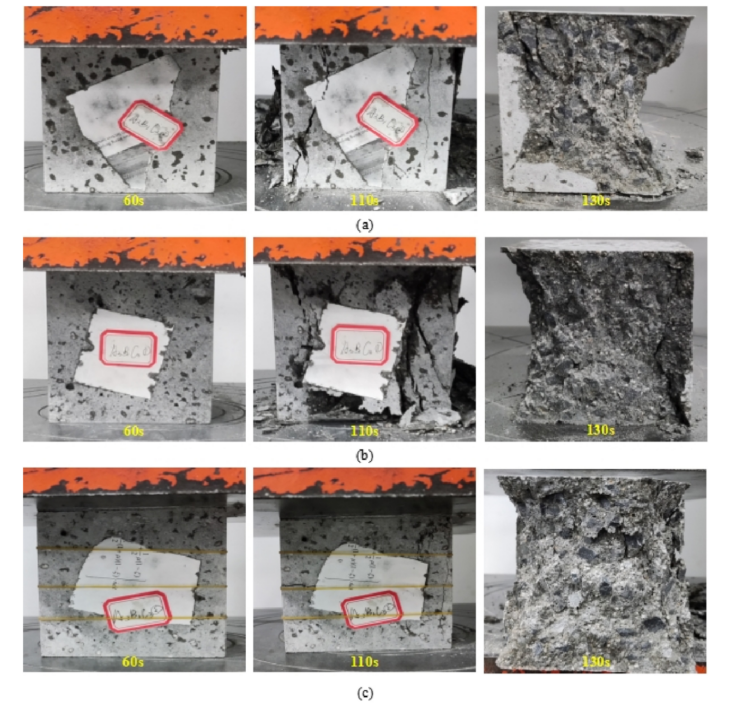 圖5. 混凝土壓縮試驗(yàn)損傷過程:(a) 3 d, (b) 7 d, (c) 28 d。