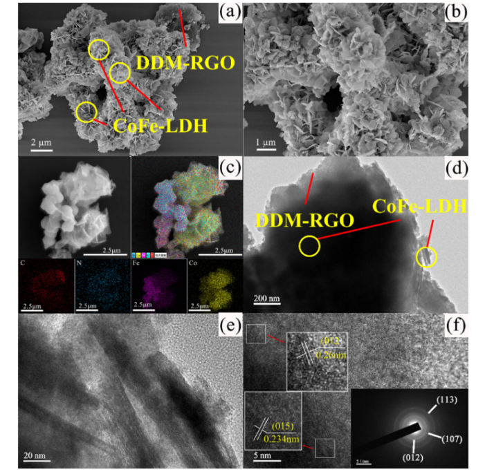 不同二維材料之間的自組裝可以有效地提高自堆積效應,促進入射電磁波(EMW)的重復反射和折射。非均質接觸引起的極化效應也有助于EMW的衰減。在本研究中,采用原位水熱法在4,4-二氨基二苯甲烷(DDM)功能化的還原氧化石墨烯(RGO)上生長,有效地制備了花瓣狀的CoFe層狀雙氫氧化物薄片(CoFe-LDH)。研究了DDM功能化RGO/ CoFe層狀雙氫氧化物復合材料(DDM-RGO/LDH)的微波吸收性能。當DDM-RGO負載為40.0 mg時,5.28 GHz處的反射損耗達到-60.0 dB,具有良好的EMW吸收性能。有效吸收帶寬在2.00 mm時為5.28 GHz。結果表明,DDM-RGO/LDH具有較寬的微波吸收帶寬和較強的吸收能力,可以作為一種先進的EMW吸收材料。